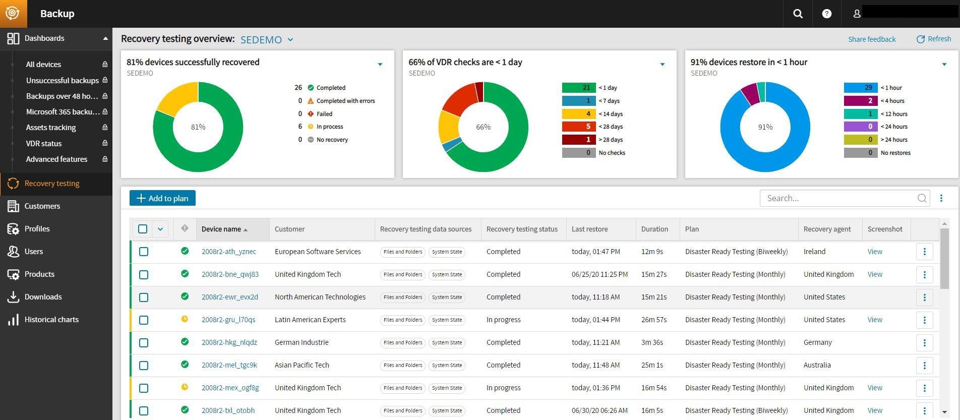 Cove Data Protection (formerly Nable Backup) protects servers, applications and databases as well as workstations and Microsoft 365 data. You can also store your backups in cloud storage at one of the 30 worldwide data centers. Flexible recovery options include file/folder/level recovery, virtual restore, and bare-metal restoration. You can reduce administrative time by managing backups from one dashboard for all your customers and all their devices and data types. Automated recovery testing allows for screenshot backup verification. TrueDelta compression, deduplication, and WAN optimization make daily backups light and quick. Cove Data Protection makes data protection simple, fast, and reliable.