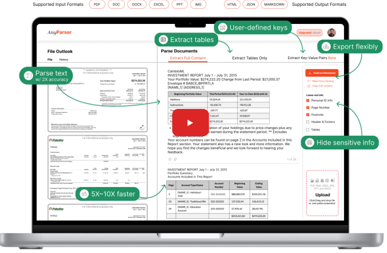 CambioML has created AnyParser, a real-time parsing tool that efficiently extracts information from a variety of file formats, such as PDFs, DOCX files, and images. This innovative solution includes features like comprehensive content parsing, key-value extraction, and the ability to extract tables, ensuring reliable and effective data retrieval. Leveraging advanced Vision Language Models (VLMs), AnyParser significantly improves document retrieval accuracy, doubling the effectiveness of traditional OCR methods and guaranteeing precise extraction of text, tables, charts, and layout details. The platform places a high priority on user privacy by conducting data processing locally, which safeguards sensitive information and maintains confidentiality. Its API is crafted for easy integration within enterprise systems, enabling users to tailor extraction rules and output formats to meet their unique requirements. AnyParser supports a wide array of file types and boasts a user-friendly interface, simplifying the data extraction process and proving to be an indispensable asset for businesses. Additionally, its adaptability ensures that companies of all sizes can optimize their workflows while managing their data securely and efficiently.
