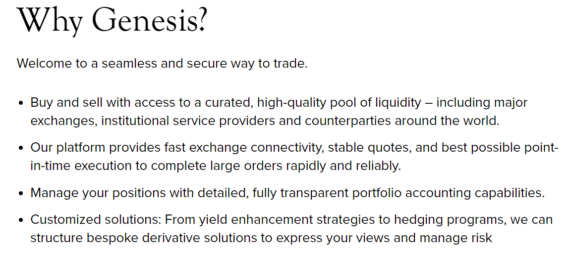 Genesis stands at the forefront of the global digital asset markets, serving as a comprehensive digital currency prime brokerage. Each month, Genesis handles billions in trades, loans, and digital currency transactions. Our experienced team, drawing on years of expertise from leading Wall Street investment banks, possesses an intricate knowledge of cryptocurrency markets. We offer a unified platform that simplifies access to digital asset trading, derivatives, lending, borrowing, custody, and prime brokerage services. This all-in-one solution is designed to meet all your digital asset requirements. As a fully operational digital currency prime broker, Genesis ensures that investors have a safe and efficient marketplace for trading, borrowing, lending, and storing their digital currencies. Clients can swiftly and dependably execute large orders. We operate as an OTC digital asset trading firm, fully regulated as a securities broker-dealer by the SEC and FINRA. Additionally, Genesis empowers clients to lend and borrow digital assets while gaining access to alternative liquidity options for hedging, speculation, and working capital needs, thereby enhancing their trading strategies and financial flexibility.