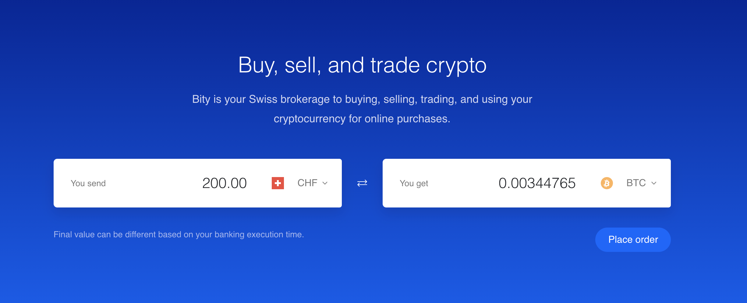 Bity serves as your gateway to the world of cryptocurrency, facilitating buying, selling, trading, and using digital currencies for online transactions. Based in Switzerland, a nation renowned for its stringent privacy laws and regulatory practices, Bity is designed with meticulous attention to the highest industry standards. Our team is dedicated to continuously testing and enhancing our technology and services to ensure optimal performance. Users can sell or exchange any supported cryptocurrency with the assurance that the estimated price remains valid as long as payment is processed within a ten-minute window. The platform enables seamless and secure transactions, whether you're looking to buy, sell, or trade cryptocurrencies through our exchange, and it also supports online bill payments in both crypto and fiat currencies. Beyond the main features, we provide additional services such as APIs, over-the-counter trading, and affiliate programs to cater to diverse needs. With just an email and phone number, you can begin your cryptocurrency journey in minutes, and accessing more advanced options is possible by verifying your account to unlock additional features. Join us and experience the future of finance, where digital assets are at your fingertips.