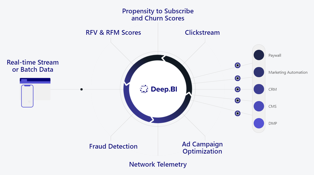 Deep.BI empowers enterprises in sectors such as Media, Insurance, E-commerce, and Banking to boost their revenues by predicting distinct user behaviors and automating processes that convert these users into paying customers while ensuring their retention. This predictive customer data platform features a real-time user scoring system supported by Deep.BI's advanced enterprise data warehouse. By utilizing this technology, digital businesses and platforms can enhance their offerings, content, and distribution strategies. The platform gathers comprehensive data regarding product utilization and content engagement, delivering immediate, actionable insights. These insights are produced within moments via the Deep.Conveyor data pipeline and can be analyzed using the Deep.Explorer business intelligence platform, which is further enhanced by the Deep.Score event scoring engine that employs tailored AI algorithms specific to your requirements. Additionally, the insights are primed for automation through the high-speed API and AI model serving capabilities of Deep.Conductor, ensuring rapid and efficient implementation. Ultimately, Deep.BI provides a holistic approach to understanding and optimizing user interactions across various digital platforms.