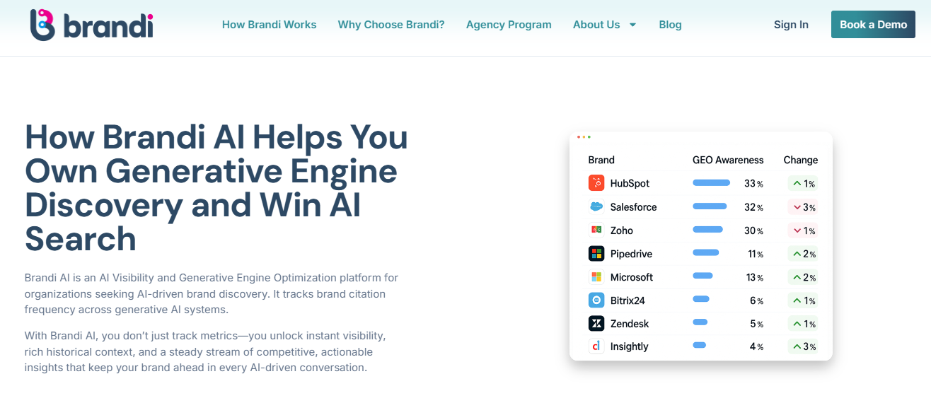 Brandi AI serves as a platform for enhancing brand visibility and optimizing generative engine performance, designed to assist brands in comprehending, monitoring, and enhancing their presence within responses produced by prominent AI systems like ChatGPT, Gemini, Claude, and Perplexity. By keeping a constant check on the frequency with which a brand is mentioned, suggested, or characterized in AI-generated content, it delivers comprehensive analytics, including AI Visibility Health Scores and Share of Voice comparisons with rivals, while providing strategic recommendations to enhance content, messaging, and technical frameworks for better visibility as reliable responses in AI-driven environments. Additionally, Brandi transforms raw outcomes from AI into actionable market insights by pinpointing relevant prompts and narrative deficiencies, assessing sentiment and competitive standing, and suggesting optimized content and structured formats to maximize brand impact. Ultimately, this platform empowers brands to not only track their visibility but also to take deliberate actions that can significantly improve their representation in the evolving landscape of generative AI.
