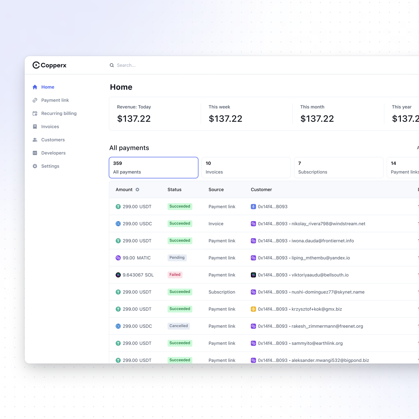 Copperx's powerful APIs work across multiple networks and currencies, enabling web3 businesses to accept fiat and blockchain payments. We offer the safest solution for businesses to accept and manage crypto payments. Our features include multiple networks & currencies with automatic swaps, transaction security, AML detection and powerful integrations into existing accounting tools. Our product offering includes APIs & SDKs for Payments, Recurring billing, Invoices and Marketplace Payments. It's similar to Stripe for Blockchain.