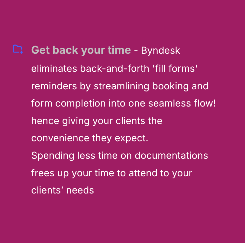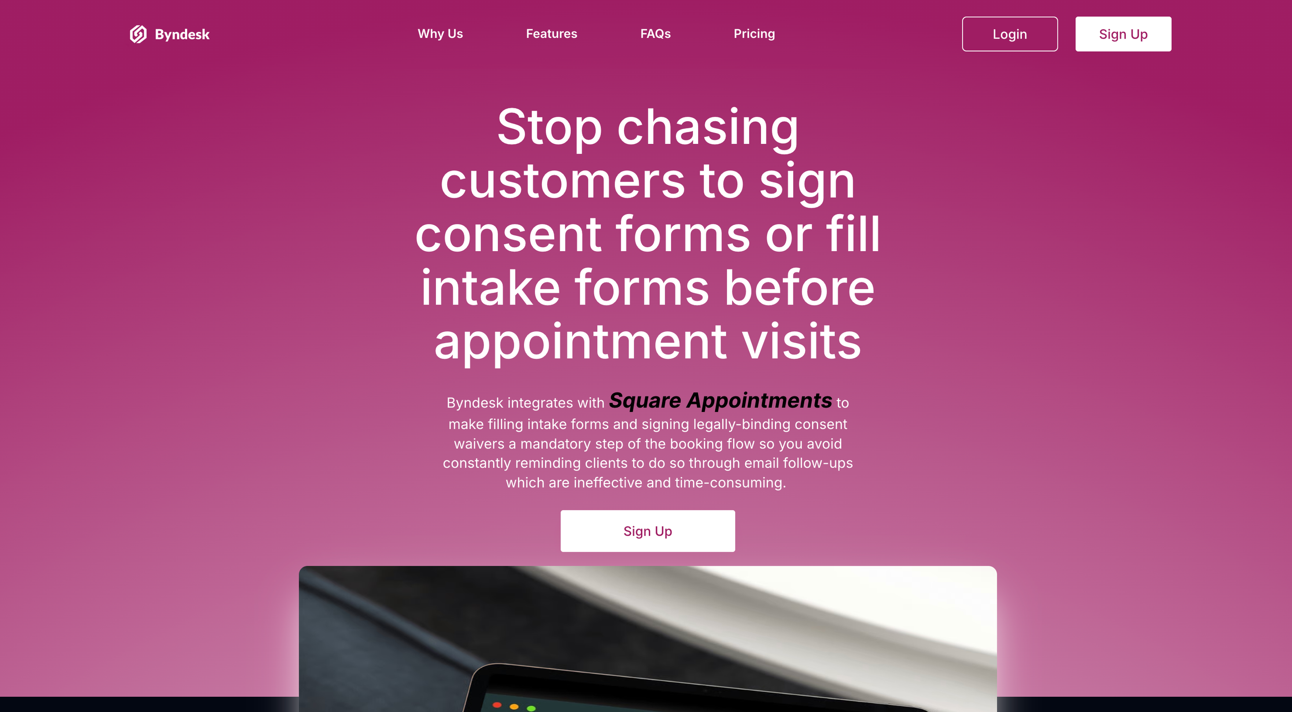 Byndesk is a powerful form-building tool that enables small businesses to design highly customized intake forms and consent waivers tailored to their specific needs. Seamlessly integrated with Square Appointments, it requires clients to complete or sign necessary documents as part of the booking checkout process. The completed forms are then automatically synced into the Square dashboard, ensuring all client data is consolidated in one place. This upfront approach eliminates the traditional hassle of collecting paperwork during appointments, saving an average of 15+ minutes per client visit. Businesses no longer need to rely on emails, reminders, or physical forms at check-in. Byndesk simplifies administrative workflows, reduces manual errors, and enhances operational efficiency. The solution provides a seamless, paperless experience for both staff and clients. Overall, it helps small businesses save time and deliver a professional booking process.