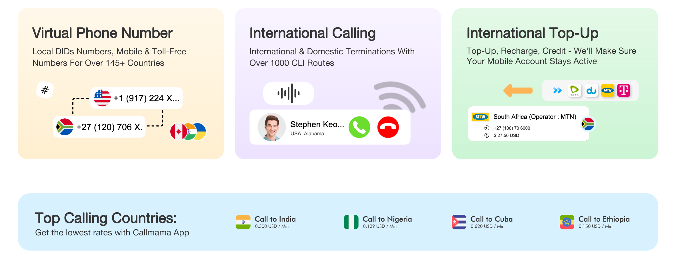 Callmama allows you to stay connected with friends and family around the world. Get virtual phone numbers in 50+ countries. Get cheap SMS and international calling rates. Call forwarding and recording ensure that you never miss a call. Video chat, account topping up, and other features make it easy to communicate internationally. Download Callmama for free to connect anywhere.