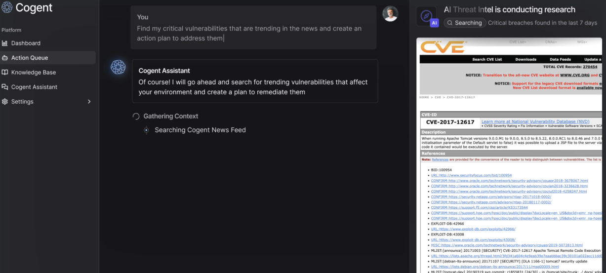Cogent Security offers a cutting-edge vulnerability management platform that leverages AI to manage the entire VM lifecycle autonomously, ensuring round-the-clock protection at rapid speeds with a reduction of manual work by 50%. The platform starts by collecting real-time information from your infrastructure, including assets, configurations, threat intelligence, and the criticality of business operations, which allows it to prioritize risks dynamically based on the likelihood of exploitation and the severity of potential impacts. By implementing ROI-focused action planning, it identifies the most valuable remediation tasks and automates the orchestration of workflows for deploying necessary patches, configuration updates, or alternative controls. With AI agents integrated into the system, continuous monitoring and adaptive planning are facilitated as new vulnerabilities arise, while program-level reporting provides executive-ready dashboards and compliance documentation whenever needed. As a result, customers experience a twofold decrease in the mean time taken to remediate severe vulnerabilities and resolve issues four times more quickly, all while maintaining their existing workforce. This innovative approach not only enhances security but also allows organizations to allocate resources more efficiently, reinforcing their overall risk management strategy.