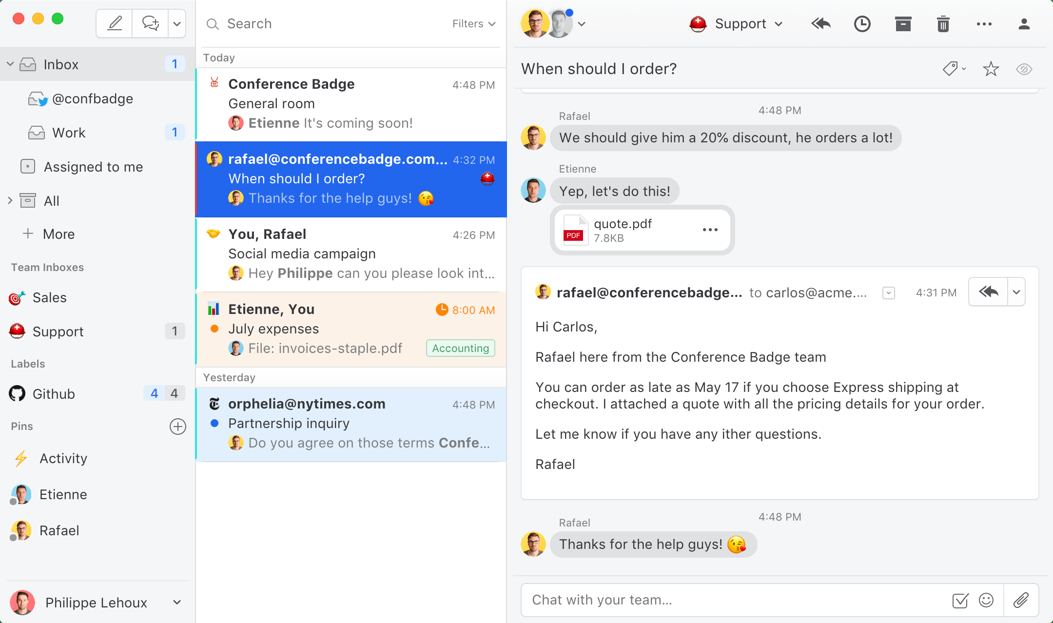 The team chat tool and inbox that allows teams to collaborate on email, SMS, WhatsApp and Twitter. The inbox was redesigned with business-first collaboration in mind. Missive allows teams to focus on their business growth. Everything you need to do the job. The Team Inbox provides a powerful workflow setting to manage your shared accounts and addresses.