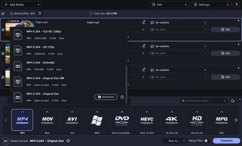 A simple program that converts movies and other digital content quickly? Movavi's media convertor for Windows and Mac is now available. You will find tons of useful features. The software supports all formats, including MP4, GIF and MOV. You don't need to be tech-savvy. You can download the app on your Mac or PC and share your media creations within minutes. Convert files quickly and easily. Compress videos with no quality loss Your video creations can be trimmed and merged. Drag and drop your files to the program window. Click the subtitles section. Browse for the appropriate subtitles and add them into your file. To save your changes, click Convert.