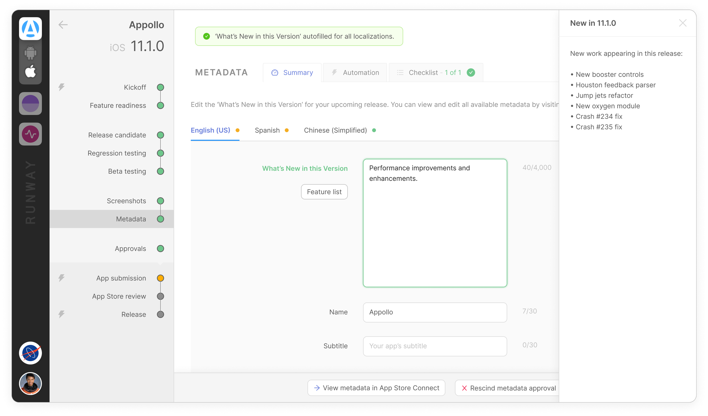 Runway will manage your releases seamlessly from the initial kickoff to the final submission, eliminating any need for manual involvement. It works in tandem with your preferred tools, providing an overview of release progress and potential obstacles. You will receive a comprehensive and contextual release runbook that clarifies task assignments and enhances tracking efficiency. Identify any blockers and gain the insight necessary to ensure a confident and timely release. With Runway, you can create interactive checklists that specify task owners, while we handle reminders via Slack. Our integration spans your entire toolchain, allowing you to monitor release status from a single browser tab instead of juggling multiple ones. Your team will receive alerts for significant milestones throughout the release cycle, including kickoffs, build outcomes, App Store review statuses, and more. Additionally, Runway automatically categorizes your releases and fills in any missing versions and labels for Jira tickets across different projects. Simply establish your release schedule, and let Runway manage everything from the initial kickoff to the final release, ensuring a smooth and efficient process. Ultimately, this streamlined approach helps teams focus on delivering quality software without the hassle of managing numerous tasks manually.