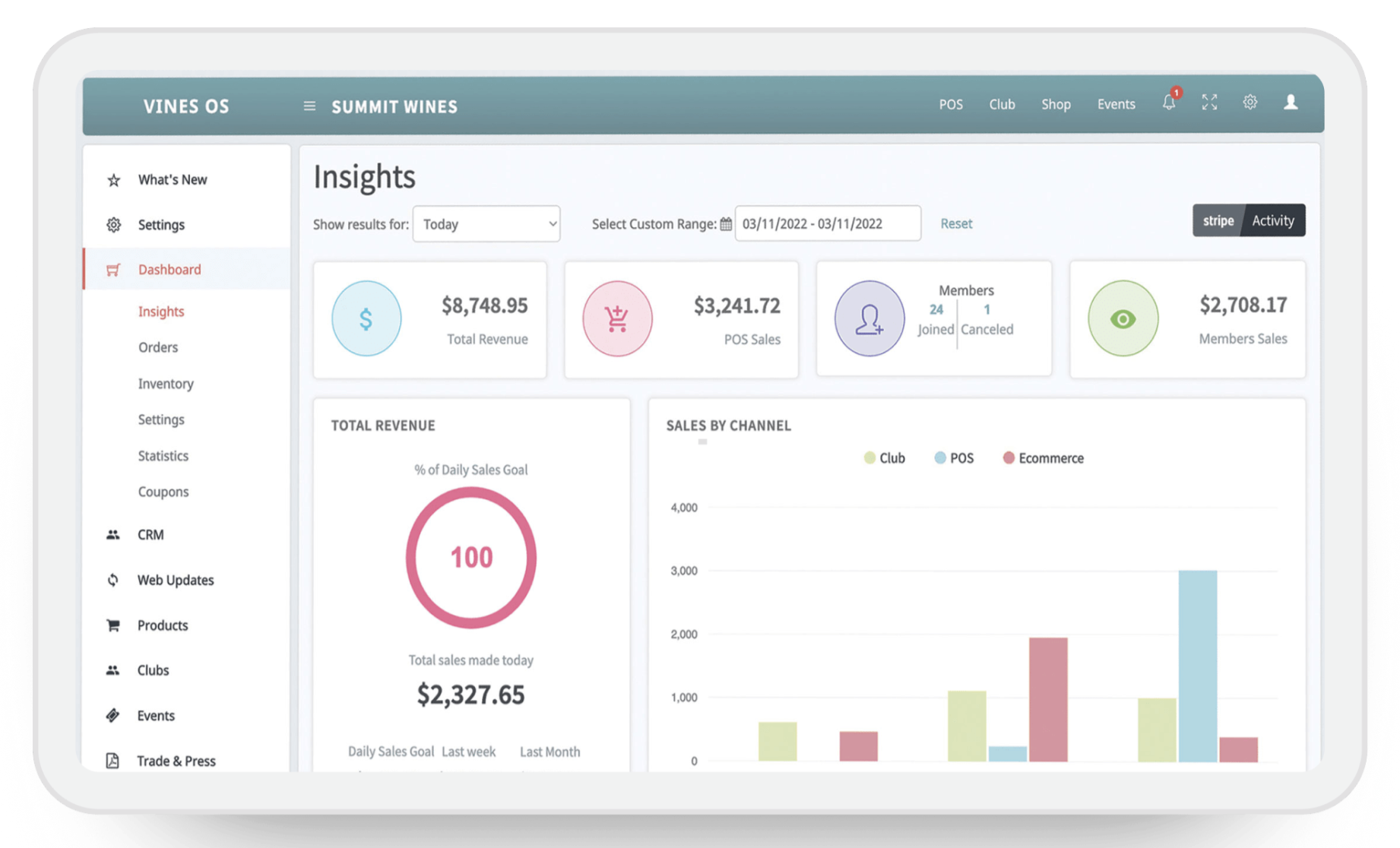 VinesOS serves as a comprehensive platform tailored to optimize winery operations by providing cohesive solutions that encompass point of sale (POS), clubs and subscriptions, eCommerce, reservations, and customer relationship management (CRM). By offering a holistic perspective on direct-to-consumer (DTC) sales, VinesOS empowers wineries to effectively oversee inventory, scrutinize sales data, and interact with their clientele. The platform facilitates mobile payments and contactless ordering while incorporating personalized marketing features through integrated email and CRM tools, which allows wineries to boost sales, elevate customer experiences, and foster growth. Additionally, VinesOS enables wineries to adapt to the evolving market landscape, ensuring they remain competitive and responsive to customer needs.