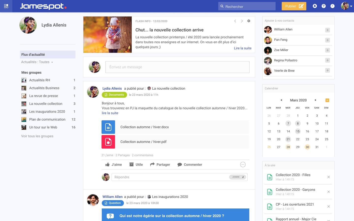Jamespot is the most popular french cloud software for collaboration and communication needs of businesses of any size, whether at the organizational or team level.