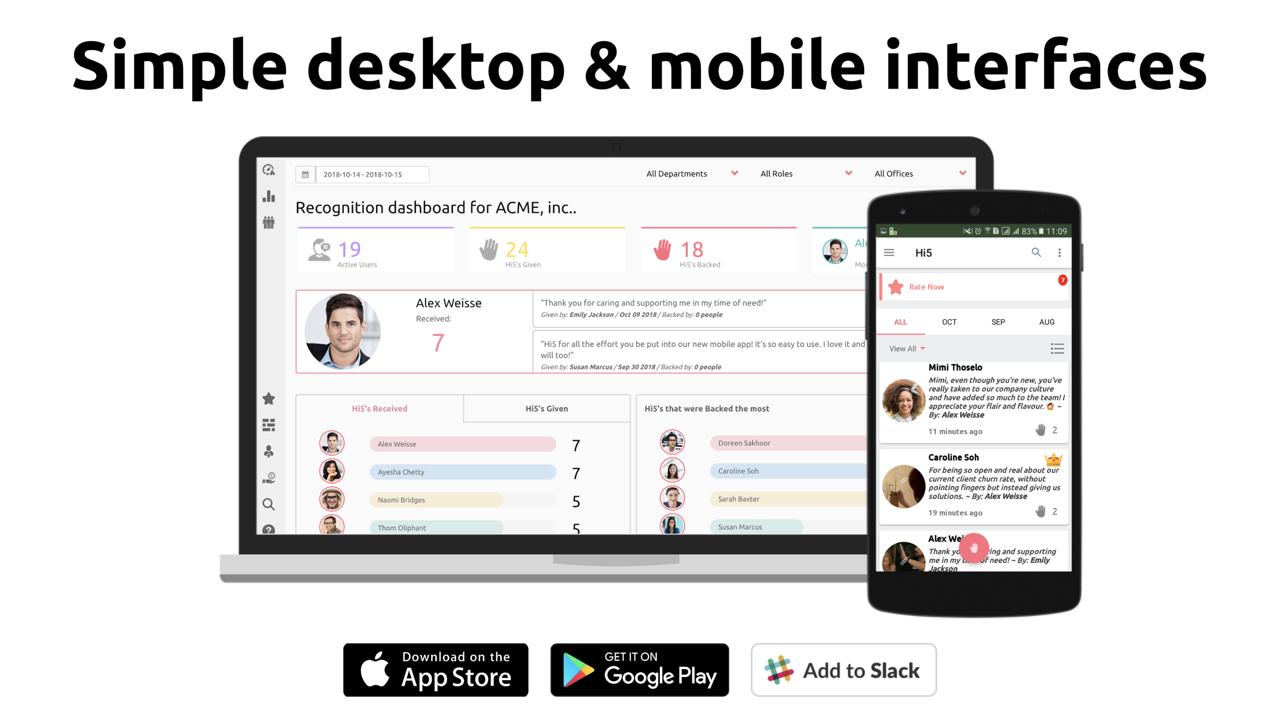 Hi5 makes it easy for people to manage others. Hi5 is a cloud-based solution that allows employees to rate and recognize each other. This helps managers and HR staff to do less administrative work. Employees can give and receive continuous feedback and recognition through Hi5 to increase their appreciation, goals, culture, happiness, and culture.