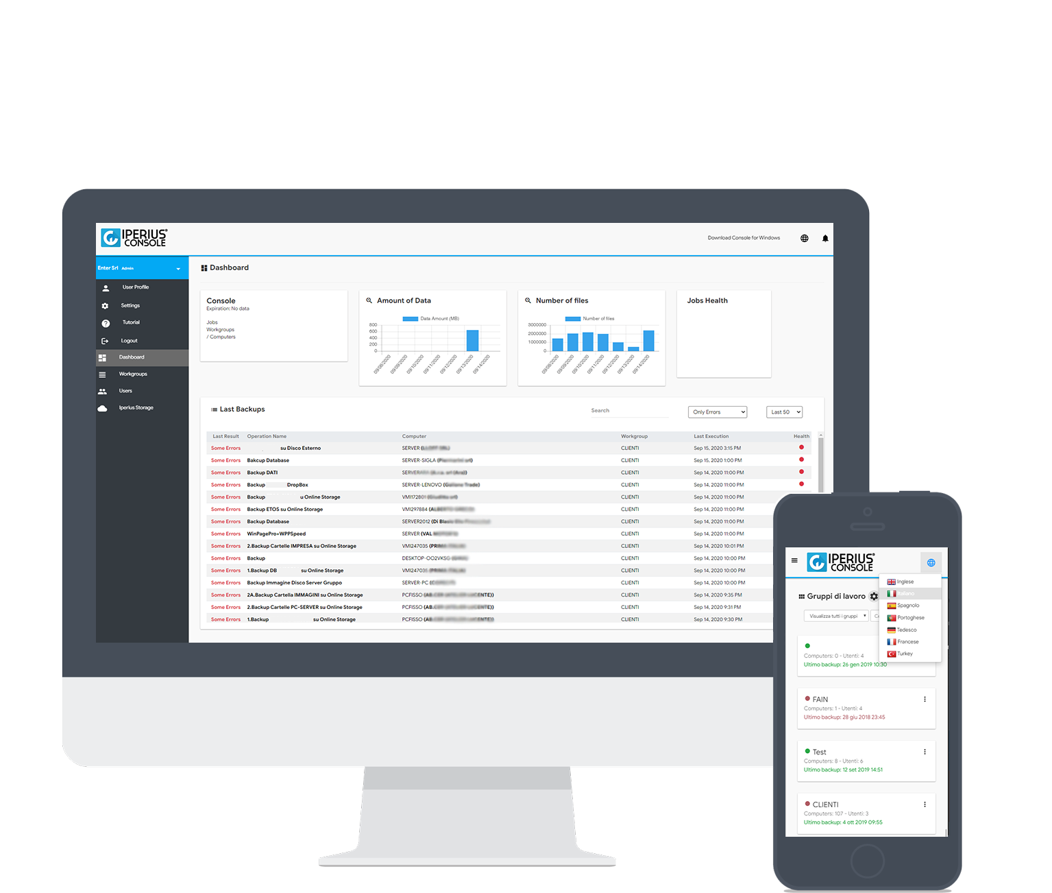 This is a simple, cost-effective and efficient solution to central security management for resellers and MSPs. Iperius Console allows you to monitor the installation of Iperius Backup as well as the health of your data protection. Iperius Console can be integrated with other products in the Iperius suite. It reduces time and costs by assisting with customer backups and monitoring IT infrastructure. Management of groups and users with customized access permissions. To be immediately informed about backups and any problems on the monitored computers, mobile devices will receive push notifications. You can create custom users and administrators with different viewing and action rights. You can create a user that has only access to specific workgroups. They can only view, but cannot backup or delete items.