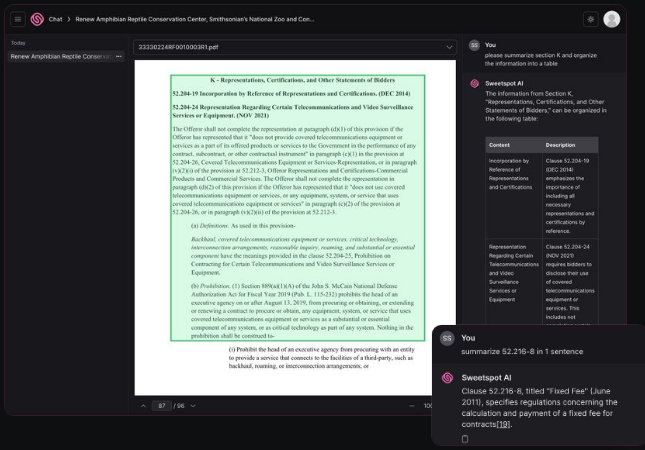 Sweetspot utilizes artificial intelligence to assist users in discovering, managing, and bidding on opportunities across federal, state, local, and educational government sectors. With Sweetspot's advanced AI-driven search capability, you can efficiently locate government contracts, grants, or SBIRs tailored to your business’s needs. Quickly determine whether to bid or not by querying Sweetspot AI regarding any RFx or grant opportunity. The platform enhances your workflow by streamlining capture processes, assigning tasks to team members, organizing documents, and monitoring the progress throughout the entire lifecycle of the pursuit. When it comes to drafting responses, Sweetspot's intelligent AI copilot, customized with your company's specific data, can facilitate the process. Unlike traditional government contracting tools that cater to isolated needs, forcing you to choose between search functions, business intelligence, and proposal drafting, Sweetspot serves as a comprehensive solution supporting you at every step of the capture process. Our team has implemented cutting-edge features specifically designed to increase your chances of securing more contracts and grants, ensuring you stay ahead in a competitive landscape. Ultimately, Sweetspot empowers businesses to navigate the complexities of government opportunities more efficiently than ever before.