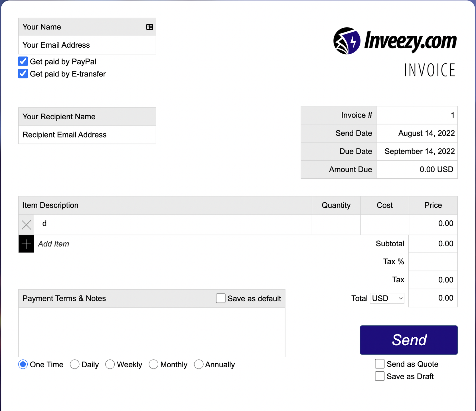 Choose from a variety of invoice templates. You can send an invoice by adding the recipient's name and email address.
