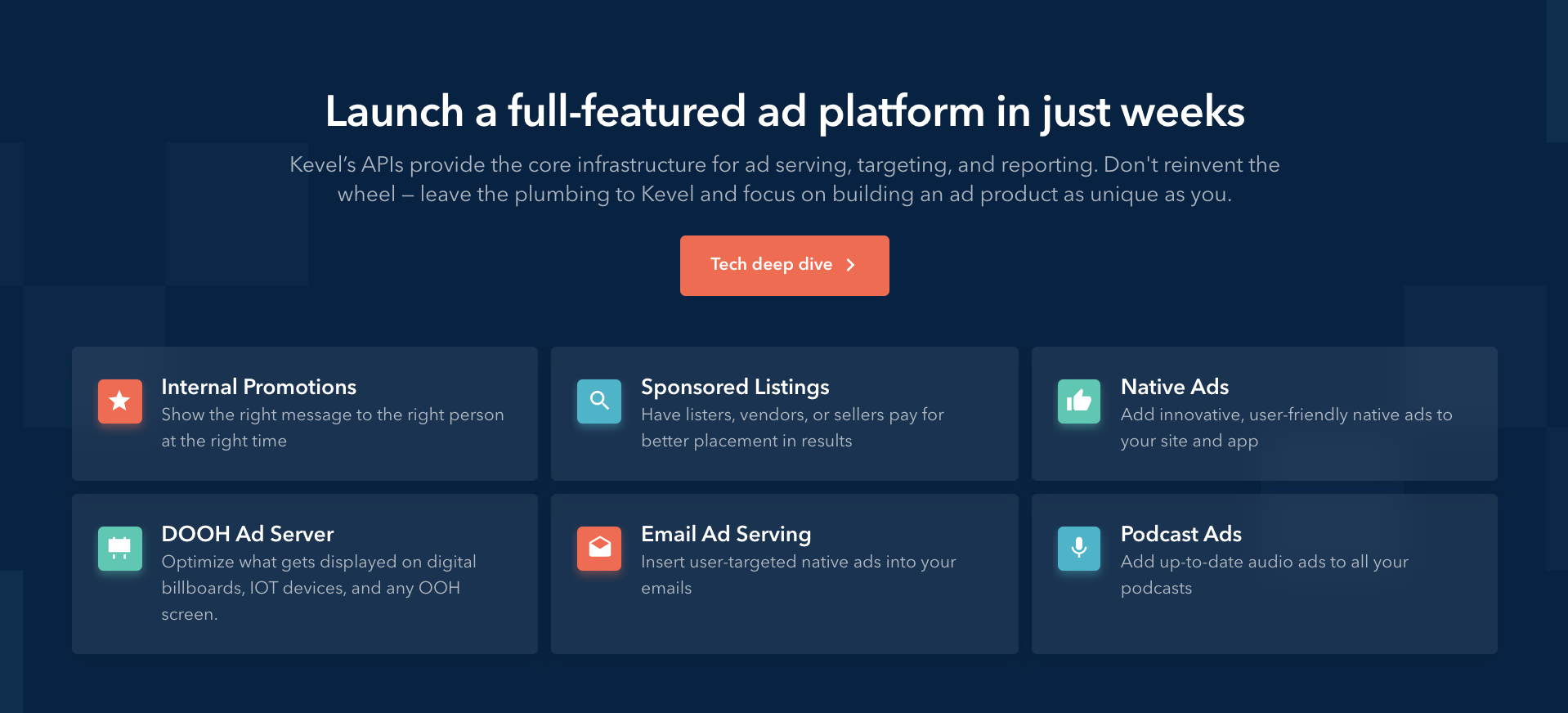 Kevel (previously Adzerk), gives you the APIs to quickly create your own fully-customized advertising server for sponsored listings, native ads, and internal promotions. This will allow you to take back the Internet and generate more online revenue. Our award-winning platform processes over three billion API requests per day and has helped industry leaders such as Yelp, Ticketmaster and others reduce their build times by more that 90%.