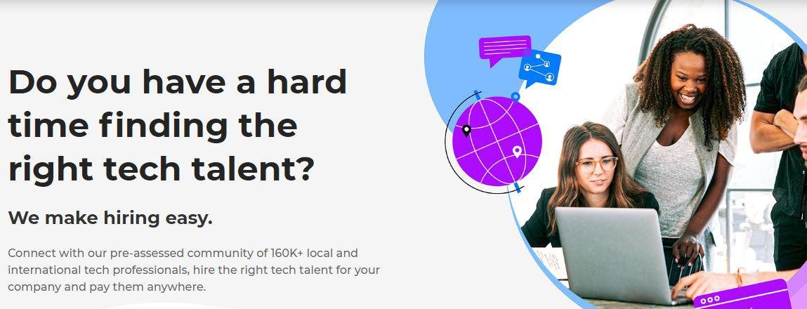 Struggling to find the ideal tech talent? Tap into our extensive network of over 160,000 vetted tech professionals, both locally and internationally, allowing you to hire the right candidates for your organization and pay them from anywhere. Engage with tech talent available right in your vicinity or from around the globe: you can either receive organic applications or actively search within our pool of highly skilled individuals to connect with your future employees. With our comprehensive channels, networks, and expertise, you will be well-equipped to attract the right professionals for your needs. Every candidate undergoes a thorough pre-screening process using advanced AI algorithms to ensure they align with your job requirements, while our dedicated team selects the most suitable applications. We also conduct interviews to understand candidates' salary expectations and work preferences, pre-assessing our community based on their technical skills, personality traits, and cognitive abilities, all of which we share with you to streamline your hiring process. By leveraging our resources, you can significantly enhance your recruitment efforts and build a strong team.