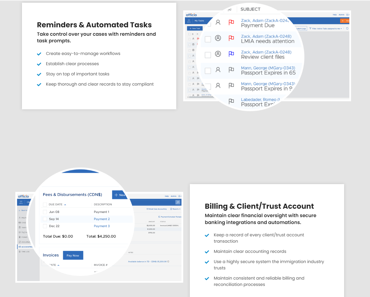 Officio’s cloud-based, intuitive solution helps you streamline client file management, maintain clear points of contact with prospects and clients, automate repetitive tasks, comply with regulatory standards, and stay up-to-date on the immigration industry.