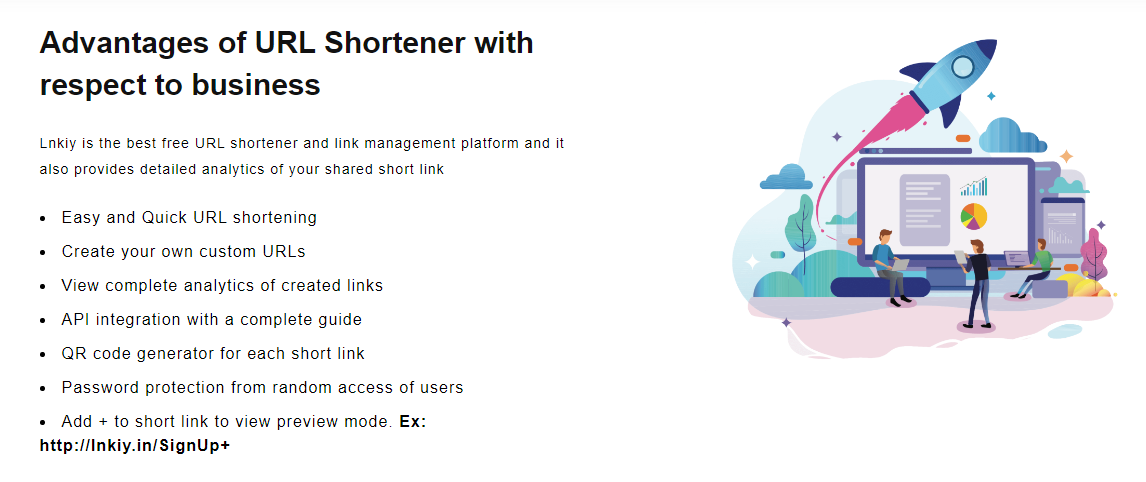 Lnkiy offers a free and feature-rich link shortening service that enhances the value and shareability of your URLs. With our platform, you can create short links that will never expire and enjoy a seamless experience without any intrusive ads during redirection. You have the freedom to optimize and personalize each shortened URL, maximizing its potential impact. Additionally, our service provides comprehensive insights into the performance of your short links, allowing you to track user engagement in real-time. You'll receive detailed analytics on clicks, social media interactions, referrer pages, device types, browsers, operating systems, and geographic locations, ensuring you have a complete understanding of your links' performance. Moreover, we offer real-time data on clicks from various social media platforms, device categories, and even the top ten most clicked links, giving you valuable information at your fingertips. To facilitate seamless integration, we provide you with an API key along with a detailed guide for query status and API integration. You can also manage and organize your projects, giving you access to domain names for your API integration, particularly for deep links, thereby streamlining your link management process.