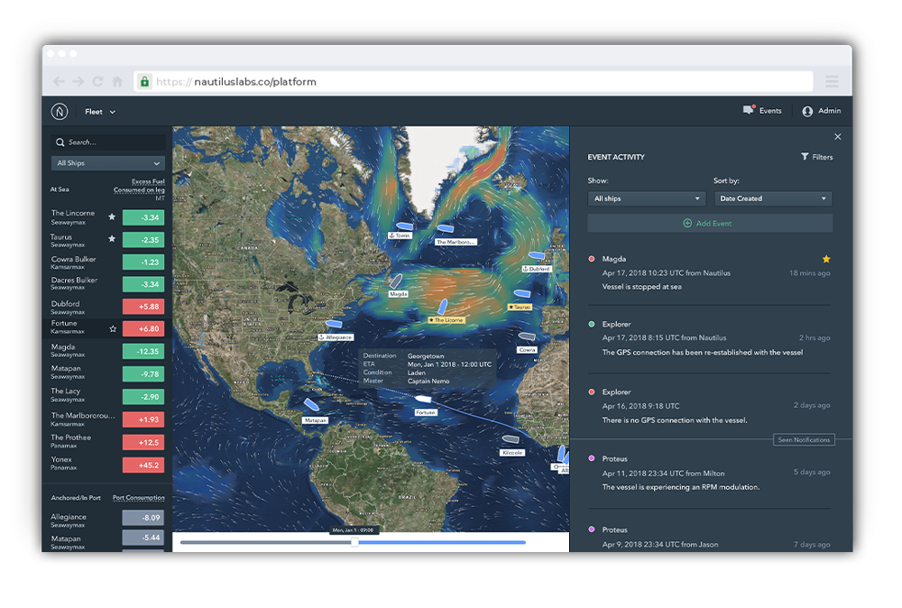 Ocean shipping uses more than $100 billion dollars in fuel each year. However, up to 30% of that fuel can be saved. Owner-operators can't optimize their fleet performance in real time if they rely on manually collected and analyzed information. Nautilus provides a unified data platform that leverages machine-learning to help its clients make better decisions and maximize the return on every ship and every voyage. This means that clients can have closer collaboration, greater transparency and greater accountability among their global teams. Ocean shipping industries waste billions of dollars every year in fuel. Nautilus provides predictive analytics for ship owners and operators to reduce fuel consumption, optimize fleet performance and maximize ROI.