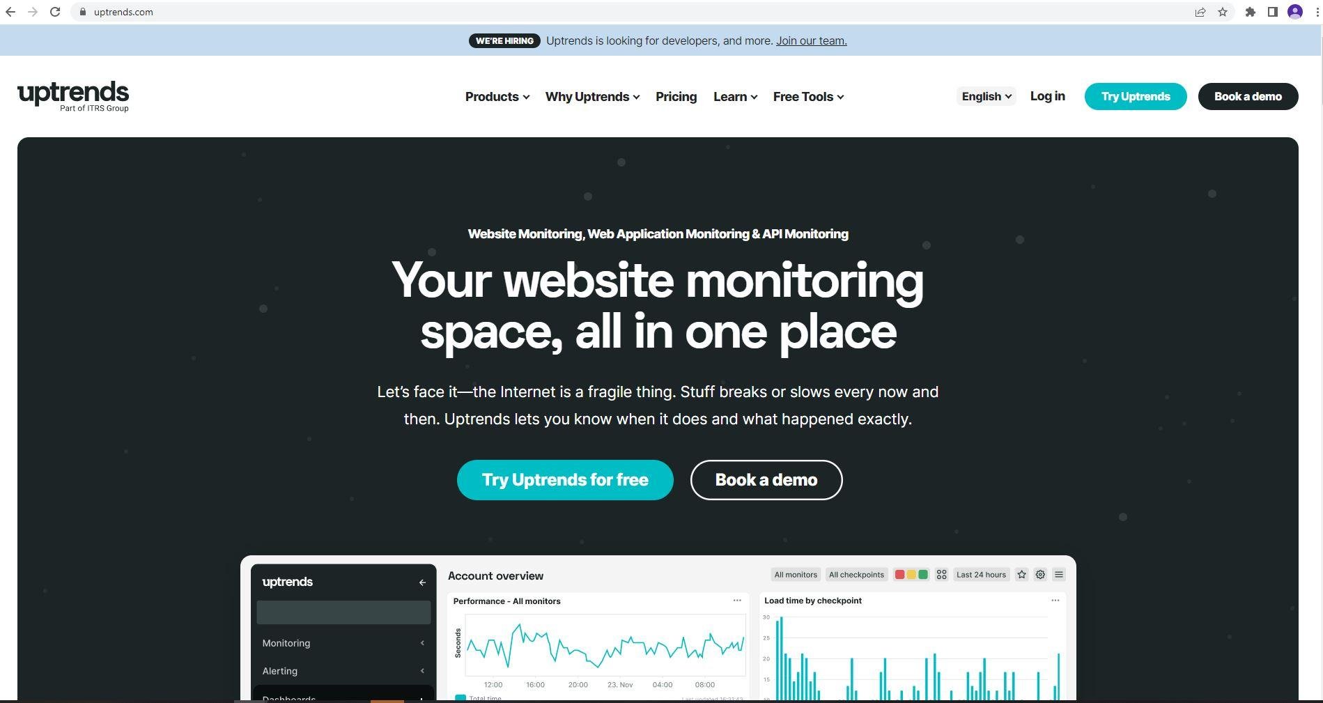 Uptrends is all about cloud-based website performance that keeps track of performance, uptime, and functionality of your websites and APIs. The 24/7 monitoring service that proactively test your website and monitor multi-step transactions.
