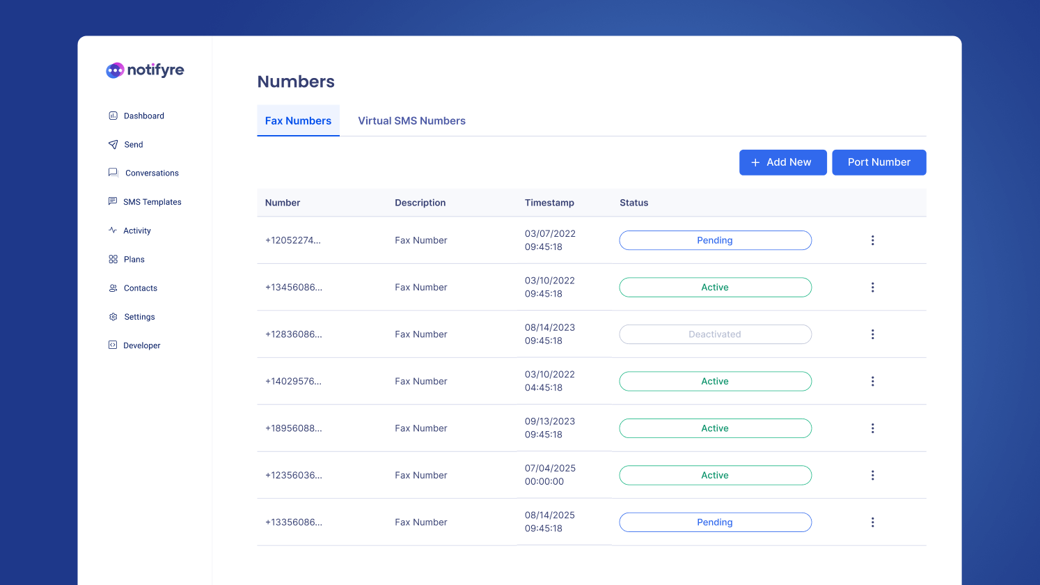 Affordable pricing for SMS numbers is now offered without any long-term commitments. Get your virtual SMS number today and initiate the registration process for 10DLC numbers, allowing your business to access high-volume online text messaging. Stay on top of your communications by tracking, measuring, and monitoring responses in real-time through an SMS inbox.