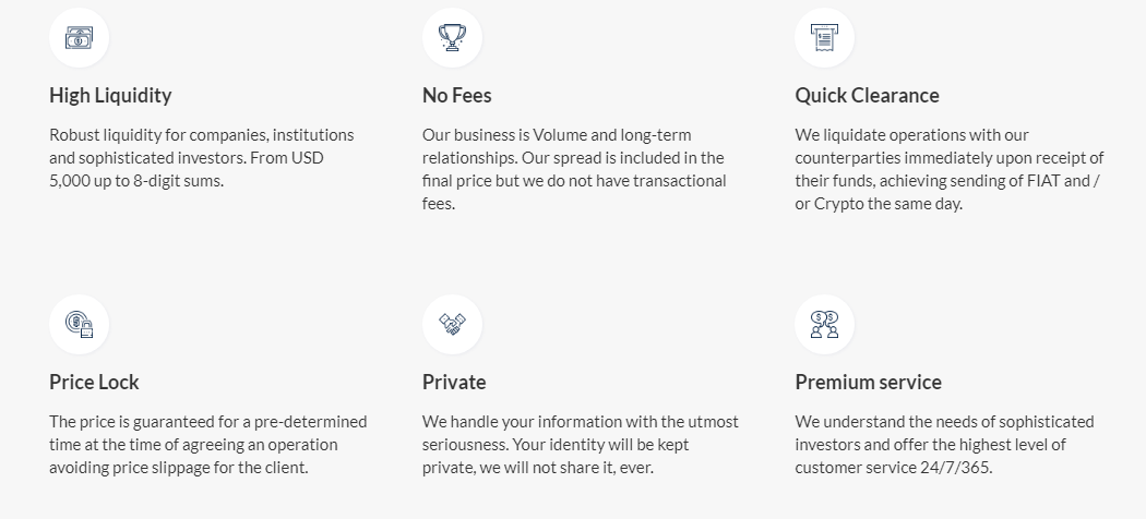 We provide a specialized service tailored for private institutions and discerning investors who seek to engage in substantial transactions characterized by fixed prices and post-trade settlement. Our offerings include Over the Counter (OTC) services for acquiring and divesting a diverse array of digital assets, complemented by around-the-clock support, extensive liquidity, prompt settlement, and multi-currency capabilities. The minimum investment threshold is set at $5,000, accommodating amounts ranging from that minimum up to eight-digit figures, ensuring robust liquidity for enterprises and sophisticated investors alike. Our business model prioritizes high volume and fostering long-term relationships, with our spread integrated into the final pricing structure, eliminating additional transactional fees. We ensure that trades are executed immediately after receiving the funds from our clients, allowing for the same-day transfer of both FIAT and cryptocurrency. Furthermore, we guarantee the agreed-upon price for a specified period during each transaction to protect our clients from potential price fluctuations. By focusing on exceptional service and reliability, we aim to build a trusted partnership with our clients that extends beyond mere transactions.