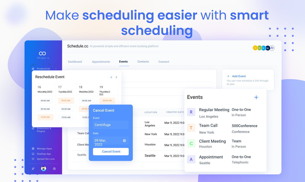 Schedule.cc is an appointment scheduling software that 500apps uses to schedule online appointments for businesses. AI-powered appointment scheduling software lets users schedule events and appointments in real time, sync their calendars, integrate with third party apps, send reminders, and manage their availability. Access to 37+ apps starting at $14.99 per user