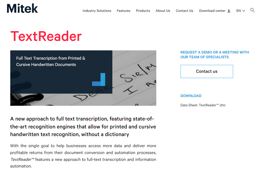 TextReader™ is designed to assist businesses in harnessing greater data access and achieving more lucrative outcomes through enhanced document conversion and automation. This innovative platform introduces a novel method for full-text transcription and information automation, allowing for the simultaneous recognition of both printed and cursive text for the very first time in the industry. As a result, various document types can be effortlessly transformed into searchable and editable formats, all without relying on a dictionary. This cutting-edge solution is powered by a unique RNN-based technology crafted by Mitek’s dedicated R&D Team, giving users comprehensive control over their recognition settings and outcomes, while facilitating both literal transcriptions and data extractions from any information format. Additionally, users can enhance recognition capabilities tailored for specific workflows and data sets by integrating a customized or trade dictionary along with language modeling features, ensuring that the system meets the precise needs of diverse operational demands. This level of flexibility not only streamlines processes but also significantly improves the accuracy and efficiency of data management.