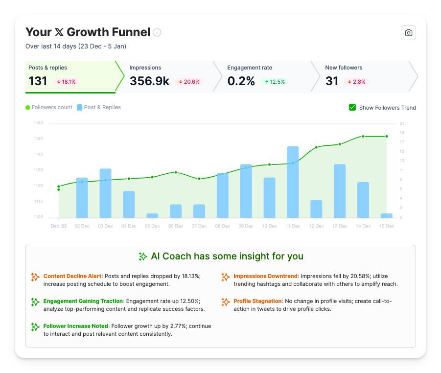 Our platform helps you effortlessly generate brilliant content ideas. It has an AI coach who refines and develops the ideas, adapting seamlessly to the users' unique tones. You can access analytics that go beyond numbers and guide you on the journey to a stronger online presence.