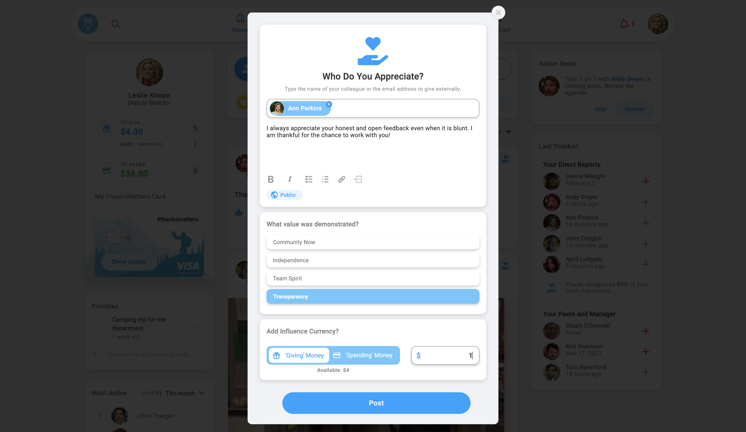 Summary: We love it and whenever people's wallets get refilled you see lots of feedback. It's a great way for feedback not to get lost in slack or teams but live in its own area.