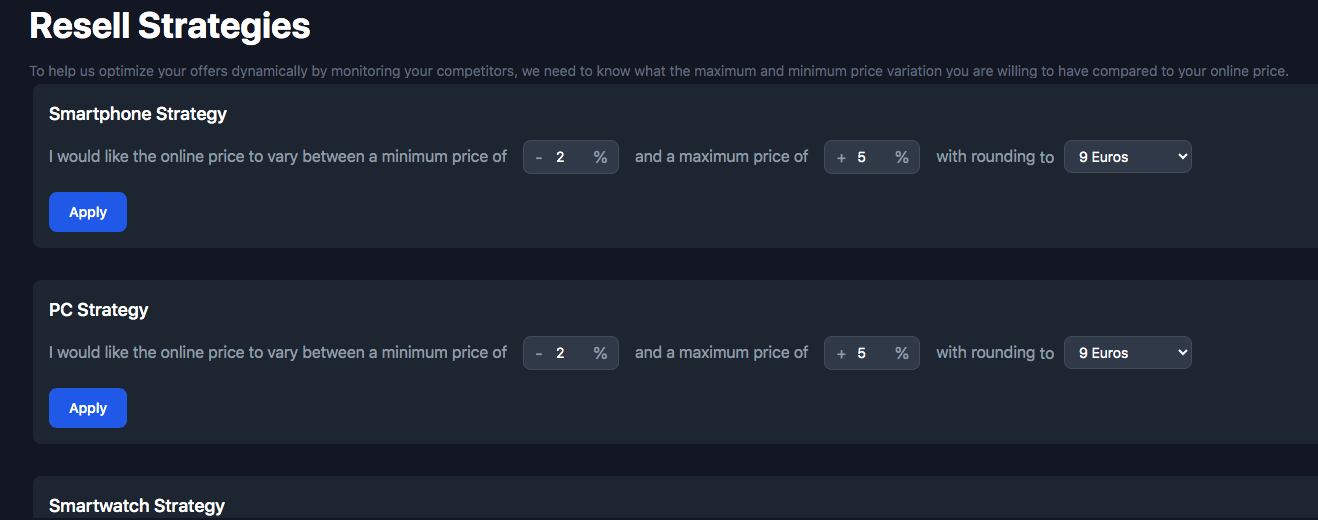 ResellWell: Increase sales and margins by using dynamic pricing algorithms, custom strategies and competitive positioning for your sales channels, online, offline and franchises. We integrate your catalogue, and directly apply your price strategies to your ecommerce or central IT system.